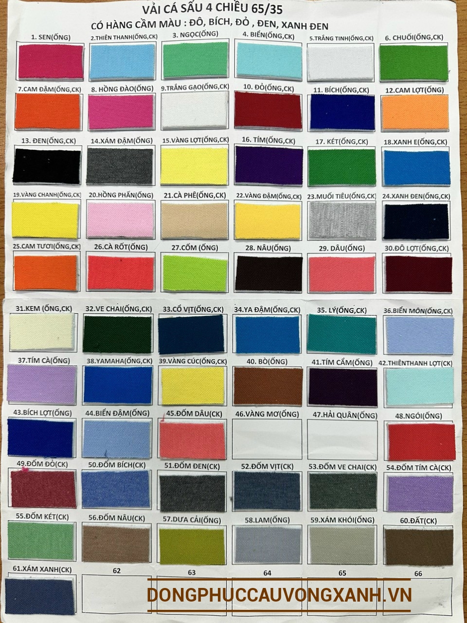 - Vải cá sấu 65/35 4 chiều: Vải dày dặn, độ co giãn tốt, lên phom mặc đẹp, ít nhăn, hút mồ hôi