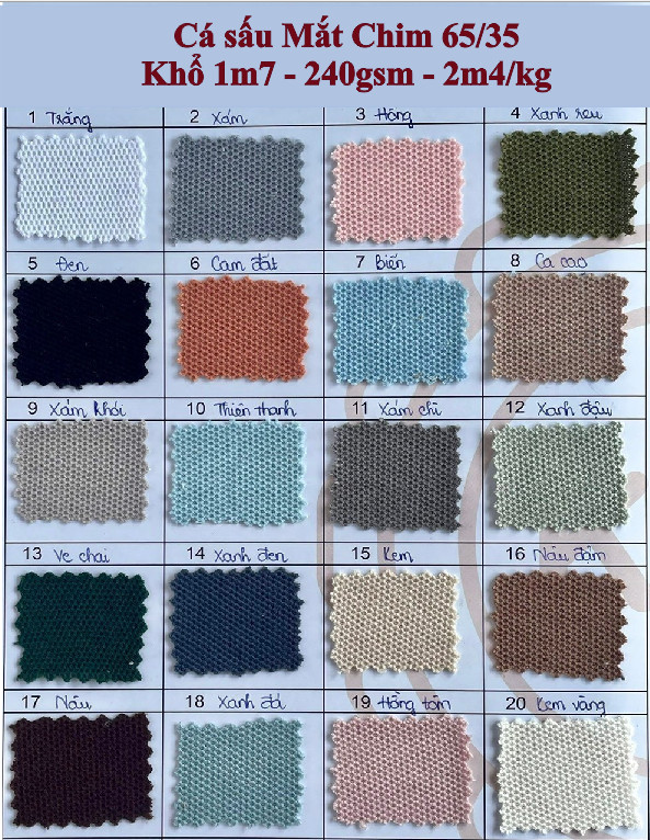 - Vải Cá sấu mắt chim 65/35 4 chiều: Vải dệt vân to, đẹp mắt, thành phần cotton nhiều, hút mồ hơi tốt, vải ít nhăn, lên phom đẹp